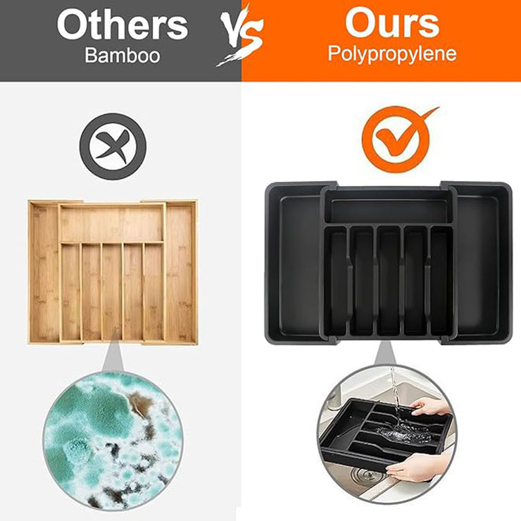 • Large Capacity: Organize your kitchen drawer and make more space with the this organizer. Comes with two expandable panels on the left and right to store more silverware, cutlery, and kitchen utensils.